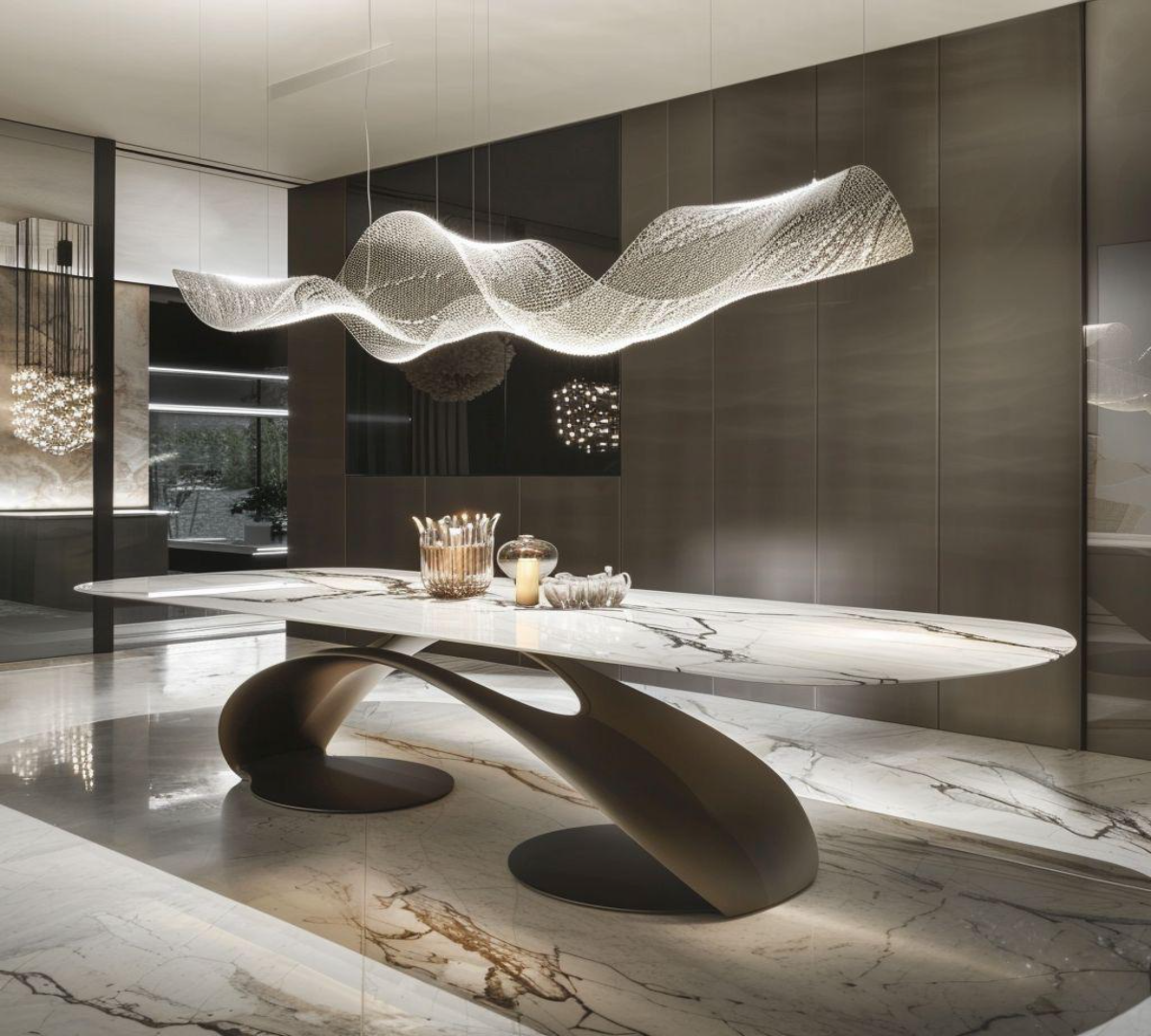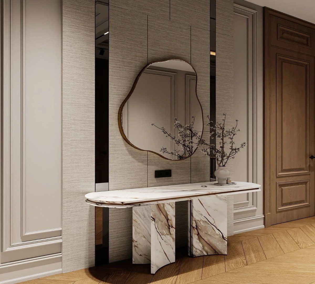 Холодное благородство камня встречается с теплом дерева, блеском металла и мягкостью текстиля, создавая диалог фактур и ощущений.