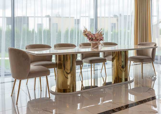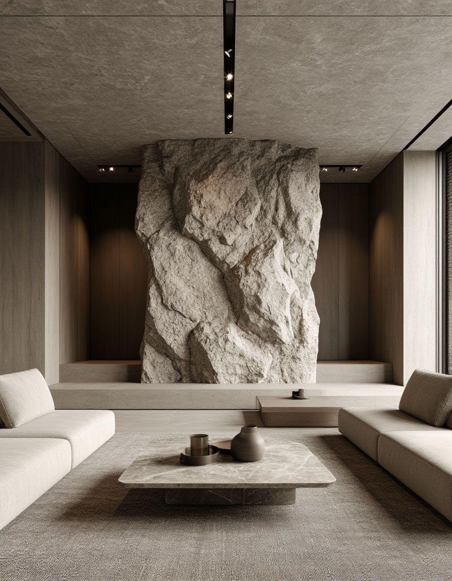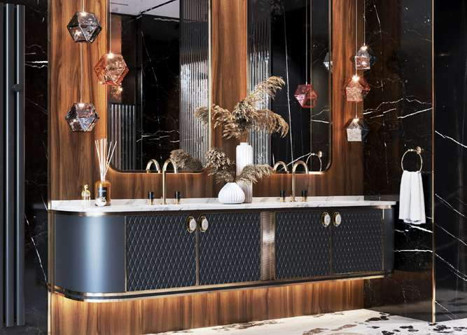 Холодное благородство камня встречается с теплом дерева, блеском металла и мягкостью текстиля, создавая диалог фактур и ощущений.